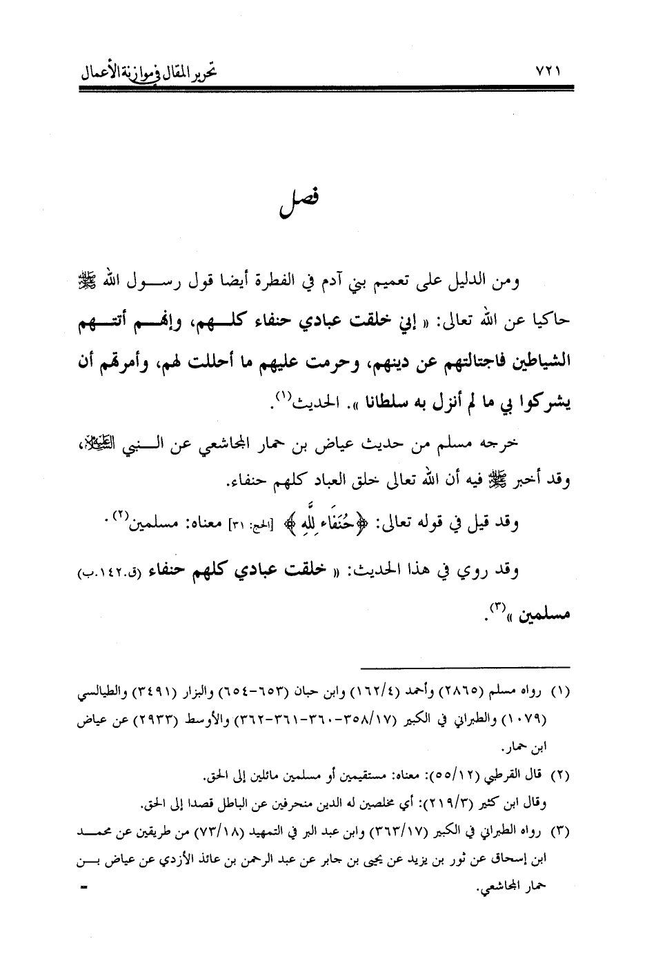 وقد روي في هذا الحديث: «خلقت عبادي كلهم حنفاء (ق.142.ب) مسلمين» (¬3).