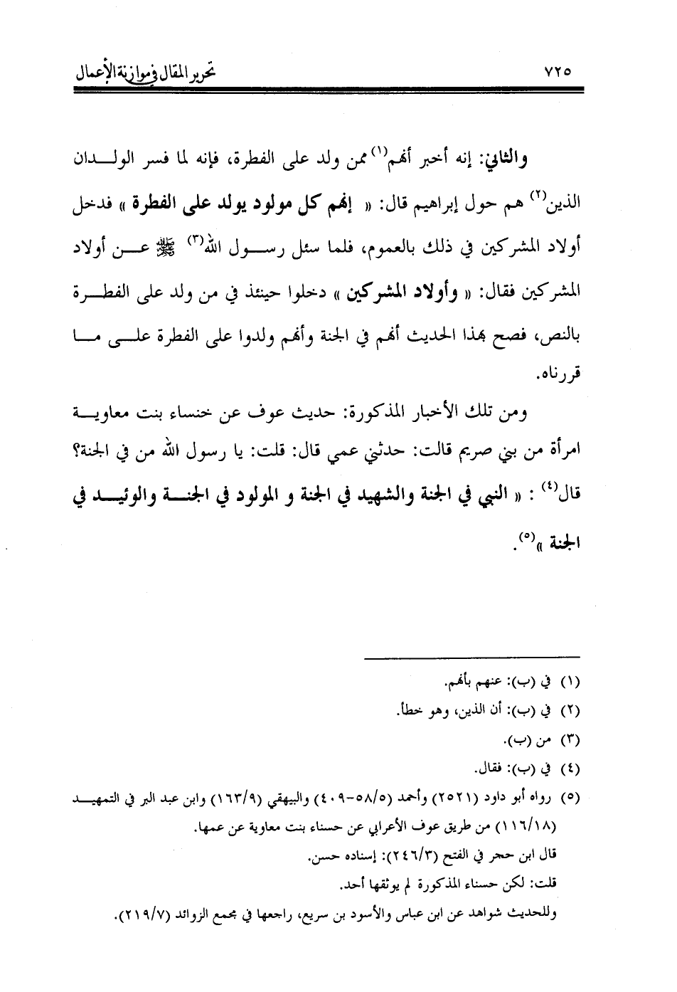 ومن تلك الأخبار المذكورة: حديث عوف عن خنساء بنت معاوية امرأة من بني صريم قالت: حدثني عمي قال: قلت: يا رسول الله من في الجنة؟ قال (¬4): «النبي في الجنة والشهيد في الجنة والمولود في الجنة والوئيد في الجنة» (¬5).
