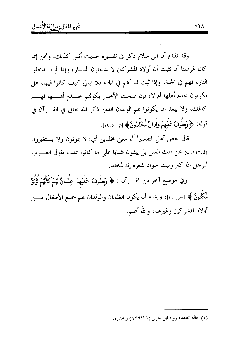 وقد تقدم أن ابن سلام ذكر في تفسيره حديث أنس كذلك، ونحن إنما كان غرضنا أن نثبت أن أولاد المشركين لا يدخلون النار، وإذا لم يدخلوا النار، فهم في الجنة، وإذا ثبت لنا أنهم في الجنة فلا نبالي كيف كانوا فيها، هل يكونون خدم أهلها أم لا، فإن صحت الأخبار بكونهم خدم أهلها فهم كذلك، ولا يبعد أن يكونوا هم الولدان الذين ذكر الله تعالى في القرآن في قوله: {وَيَطُوفُ عَلَيْهِمْ وِلْدَانٌ مُّخَلَّدُونَ} [الإنسان: 19].
