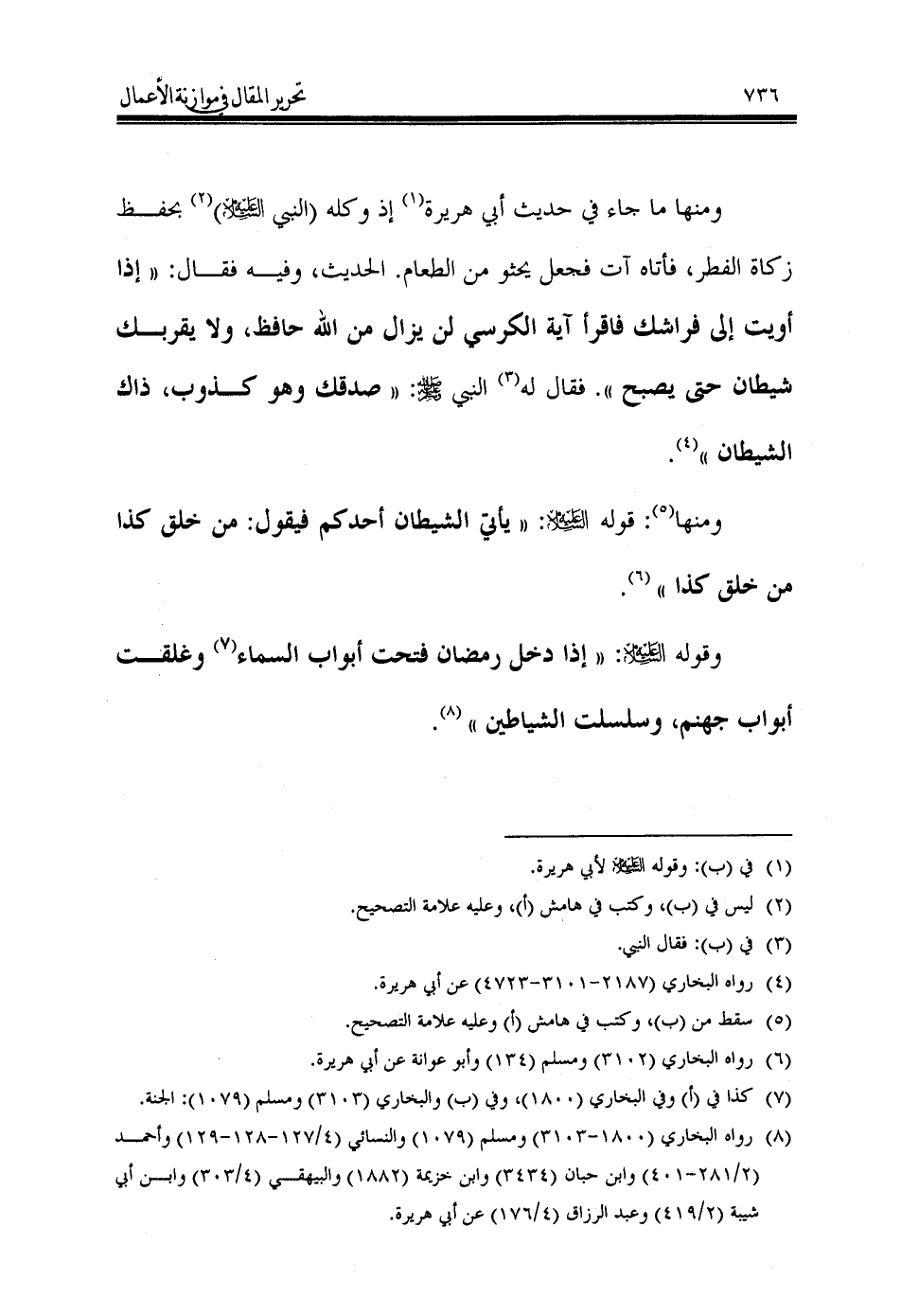 (¬8) رواه البخاري (1800 - 3103) ومسلم (1079) والنسائي (4/ 127 - 128 - 129) وأحمد (2/ 281 - 401) وابن حبان (3434) وابن خزيمة (1882) والبيهقي (4/ 303) وابن أبي شيبة (2/ 419) وعبد الرزاق (4/ 176) عن أبي هريرة.