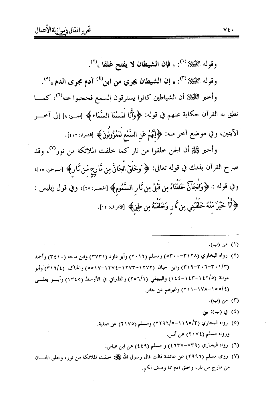 (¬7) روى مسلم (2996) عن عائشة قالت قال رسول الله - صَلَّى اللهُ عَلَيْهِ وَسَلَّمَ -: خلقت الملائكة من نور، وخلق الجان من مارج من نار، وخلق آدم مما وصف لكم.