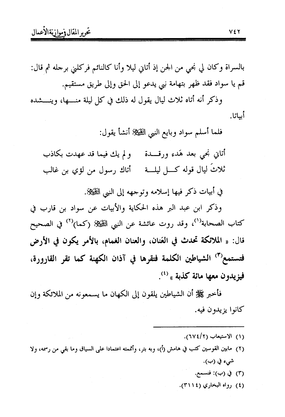وذكر ابن عبد البر هذه الحكاية والأبيات عن سواد بن قارب في كتاب الصحابة (¬1)، وقد روت عائشة عن النبي - عليه السلام - (كما) (¬2) في الصحيح قال: «الملائكة تحدث في العَنان، والعنان الغمام، بالأمر يكون في الأرض فتستمع (¬3) الشياطين الكلمة فتقرها في آذان الكهنة كما تقر القارورة، فيزيدون معها مائة كذبة» (¬4).