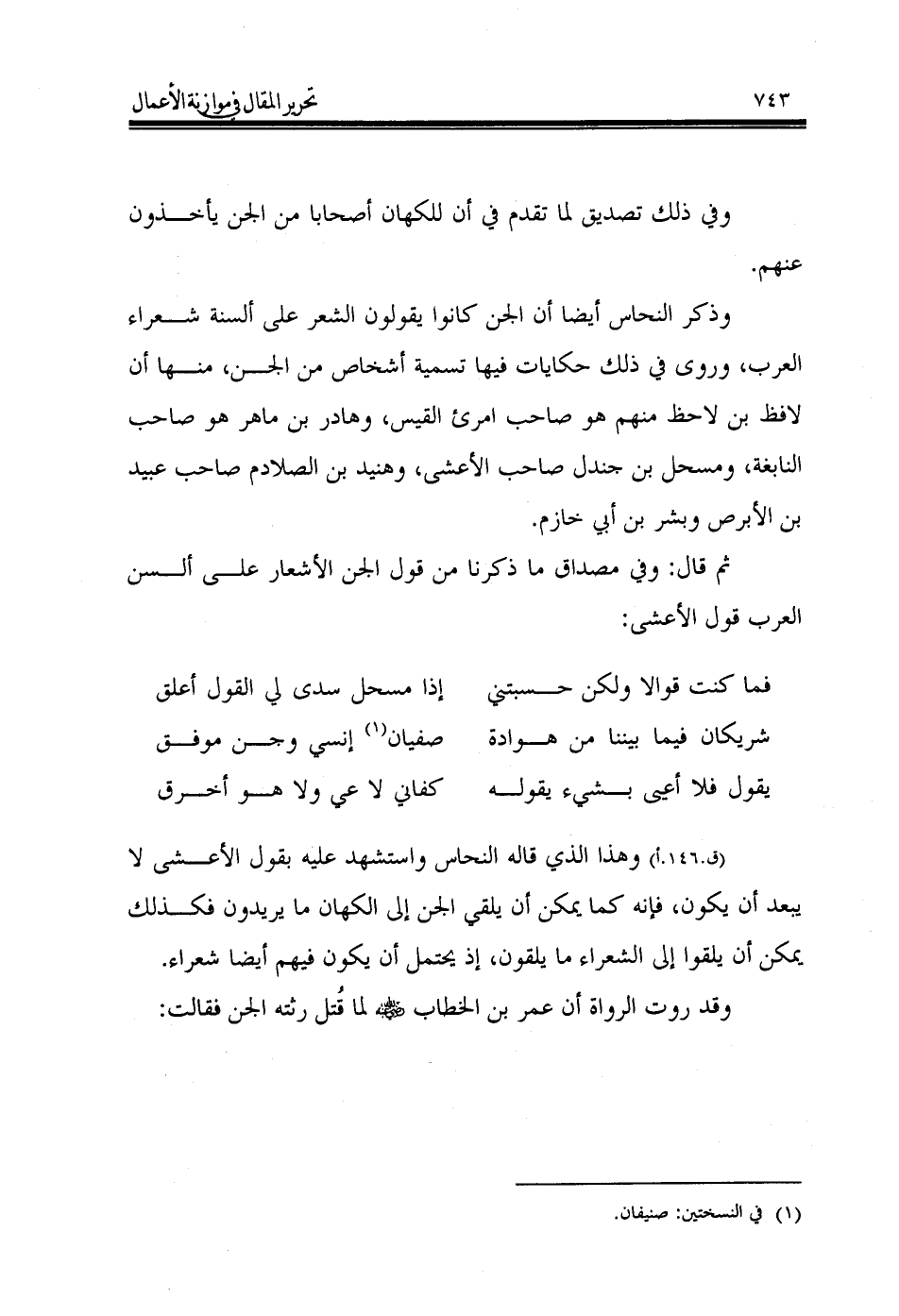 (ق.146.أ) وهذا الذي قاله النحاس واستشهد عليه بقول الأعشى لا يبعد أن يكون، فإنه كما يمكن أن يلقي الجن إلى الكهان ما يريدون فكذلك يمكن أن يلقوا إلى الشعراء ما يلقون، إذ يحتمل أن يكون فيهم أيضا شعراء.