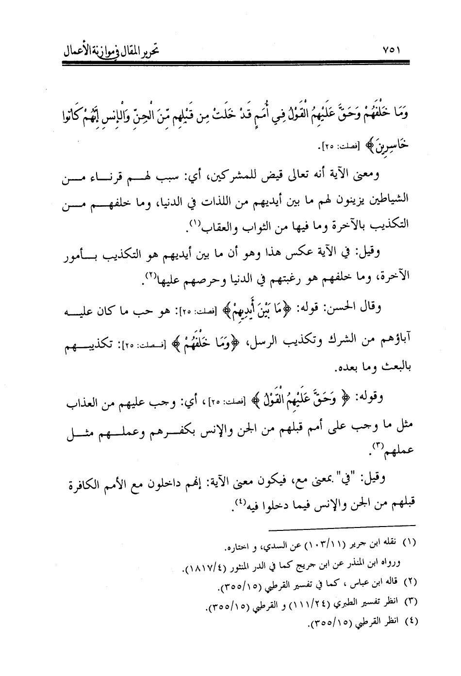 وقوله: {وَحَقَّ عَلَيْهِمُ الْقَوْلُ} [فصلت: 25]، أي: وجب عليهم من العذاب مثل ما وجب على أمم قبلهم من الجن والإنس بكفرهم وعملهم مثل عملهم (¬3).