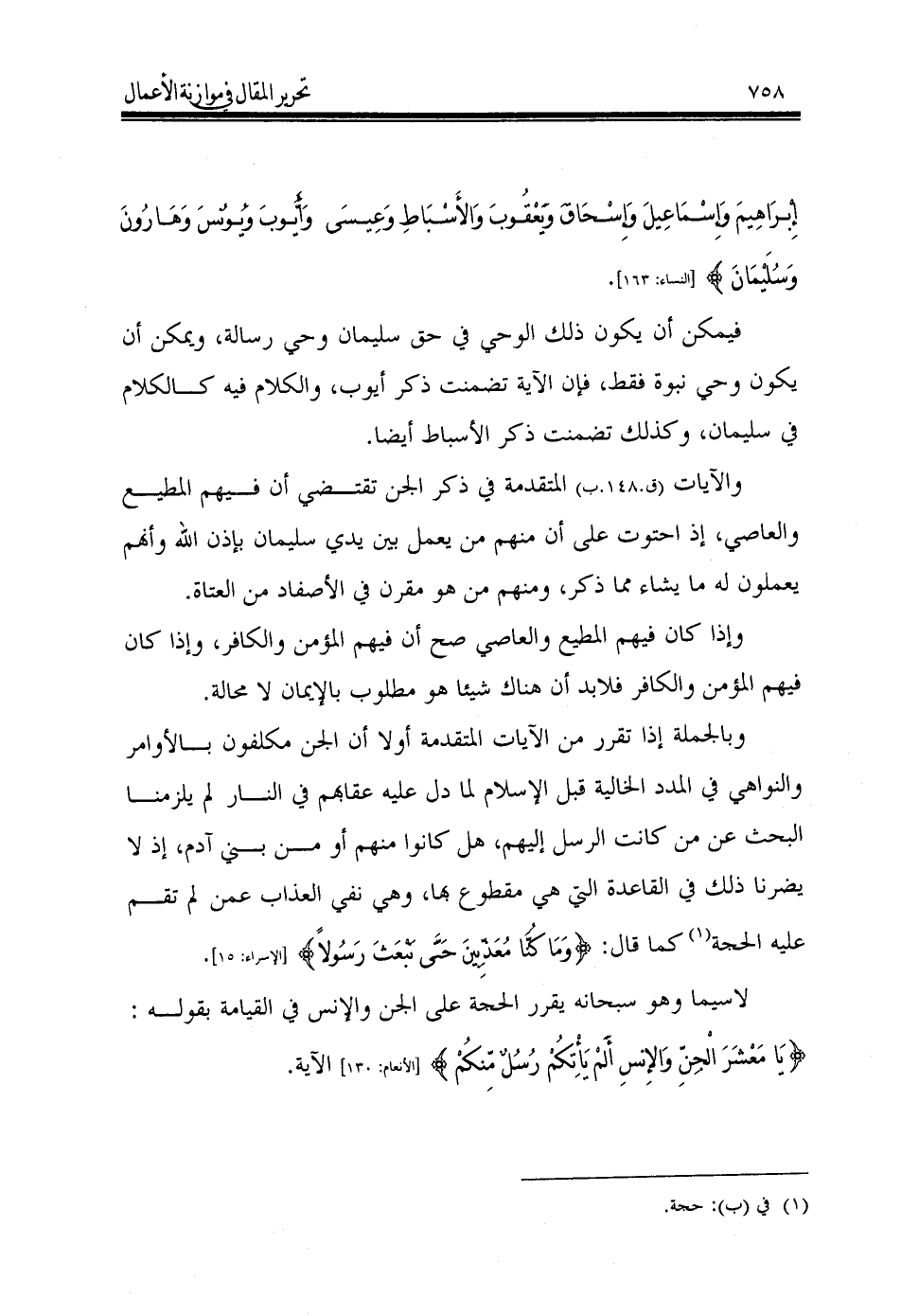 والآيات (ق.148.ب) المتقدمة في ذكر الجن تقتضي أن فيهم المطيع والعاصي، إذ احتوت على أن منهم من يعمل بين يدي سليمان بإذن الله وأنهم يعملون له ما يشاء مما ذكر، ومنهم من هو مقرن في الأصفاد من العتاة.