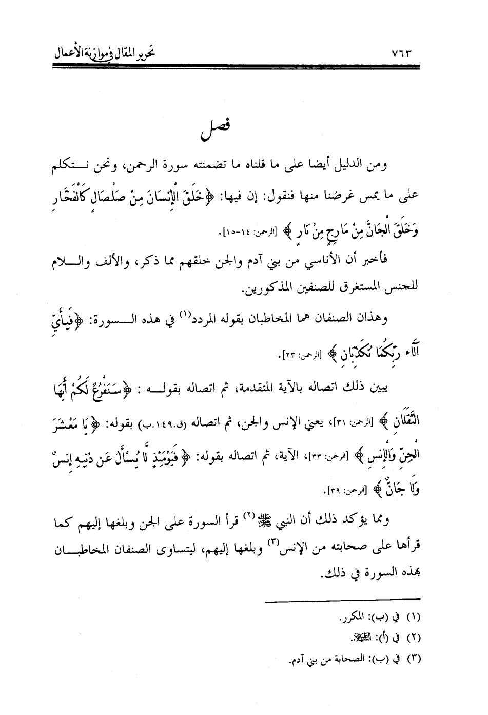 ومن الدليل أيضا على ما قلناه ما تضمنته سورة الرحمن، ونحن نتكلم على ما يمس غرضنا منها فنقول: إن فيها: {خَلَقَ الْإِنْسَانَ مِنْ صَلْصَالٍ كَالْفَخَّارِ وَخَلَقَ الْجَانَّ مِنْ مَارِجٍ مِنْ نَارٍ} [الرحمن: 14 - 15].