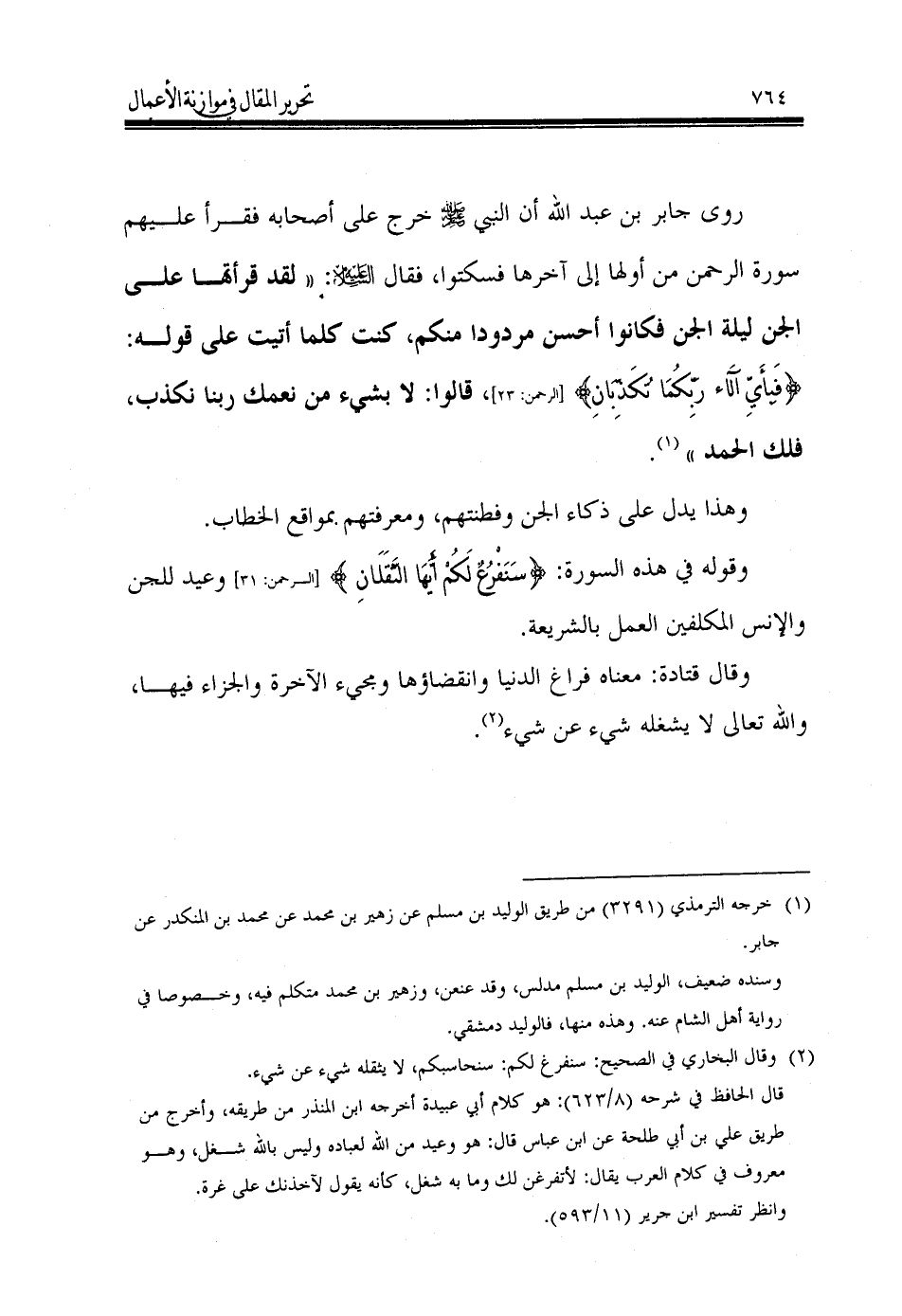 روى جابر بن عبد الله أن النبي - صَلَّى اللهُ عَلَيْهِ وَسَلَّمَ - خرج على أصحابه فقرأ عليهم سورة الرحمن من أولها إلى آخرها فسكتوا، فقال - عليه السلام -: «لقد قرأتها على الجن ليلة الجن فكانوا أحسن مردودا منكم، كنت كلما أتيت على قوله: {فَبِأَيِّ آلَاء رَبِّكُمَا تُكَذِّبَانِ} [الرحمن: 23]، قالوا: لا بشيء من نعمك ربنا نكذب، فلك الحمد» (¬1).