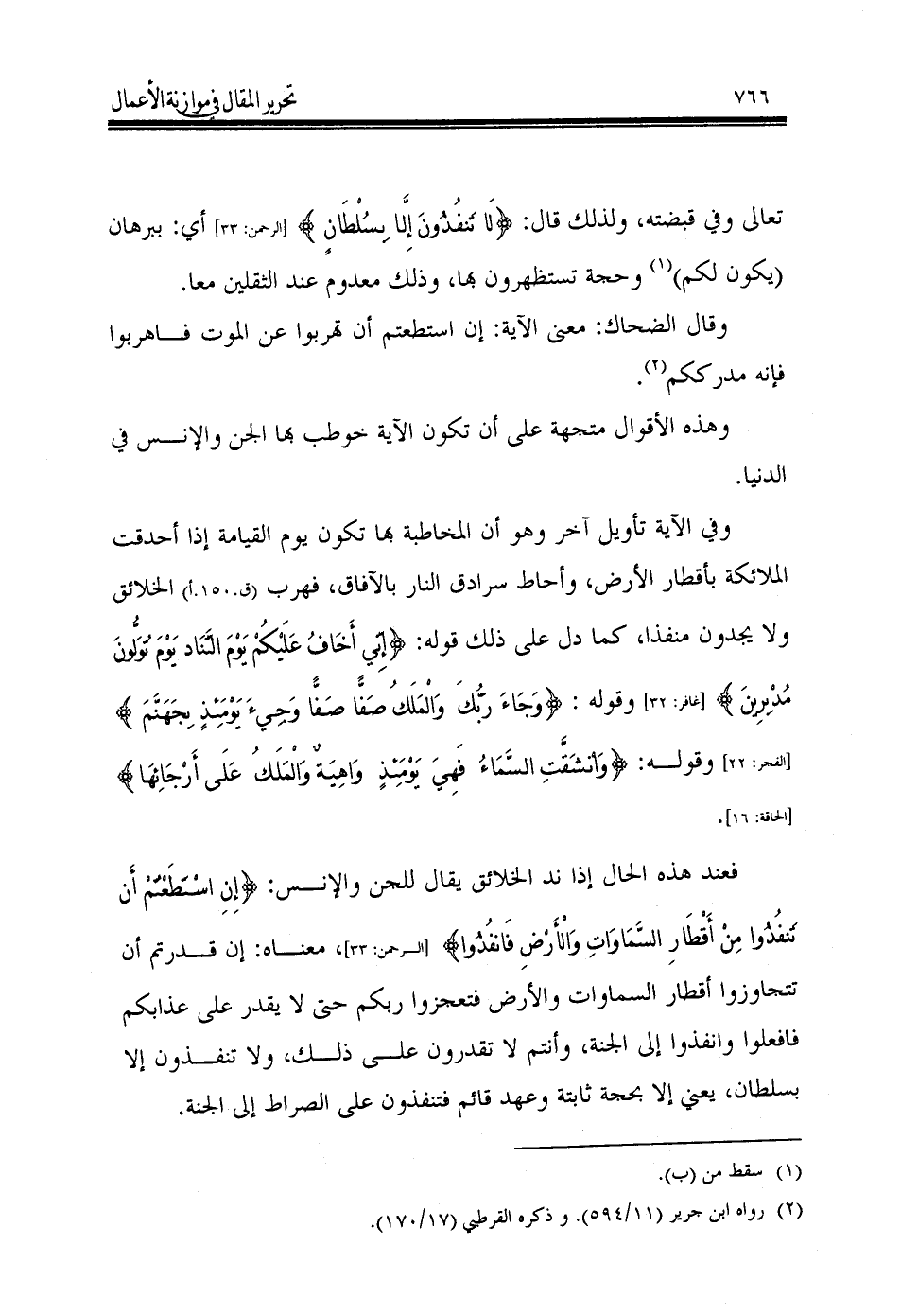 فعند هذه الحال إذا ند الخلائق يقال للجن والإنس: {إِنِ اسْتَطَعْتُمْ أَن تَنفُذُوا مِنْ أَقْطَارِ السَّمَاوَاتِ وَالْأَرْضِ فَانفُذُوا} [الرحمن: 33]، معناه: إن قدرتم أن تتجاوزوا أقطار السماوات والأرض فتعجزوا ربكم حتى لا يقدر على عذابكم فافعلوا وانفذوا إلى الجنة، وأنتم لا تقدرون على ذلك، ولا تنفذون إلا بسلطان، يعني إلا بحجة ثابتة وعهد قائم فتنفذون على الصراط إلى الجنة.