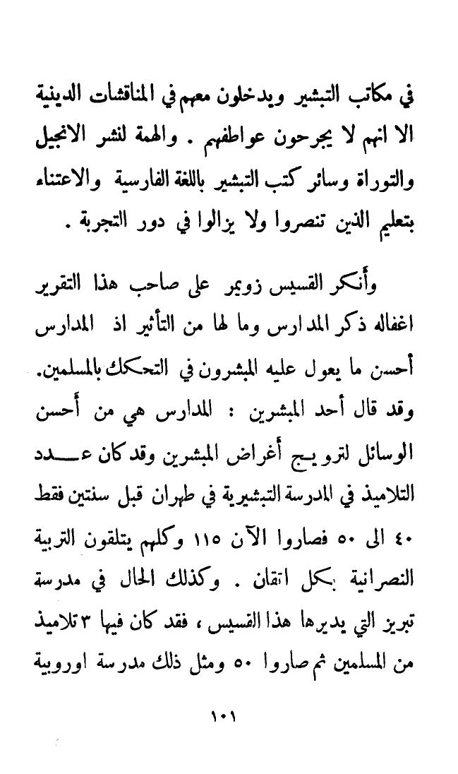 وقد قال أحد المبشرين: المدارس هي من أحسن الوسائل لترويج أغراض المُبَشِّرِينَ وقد كان عدد التلاميذ في المدرسة التبشيرية في طهران قبل سنتين فقط 40 إلى 50 فصاروا الآن 115 وكلهم يتلقون التربية النصرانية بكل إتقان. وكذلك الحال في مدرسة تبريز التي يديرها هذا القسيس، فقد كان فيها 3 تلاميذ من المسلمين ثم صاروا 50 ومثل ذلك مدرسة أوروبية