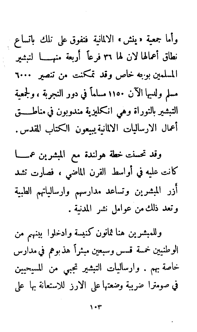 وأما جمعية «ينش» الألمانية فتفوق على تلك باتساع نطاق أعمالها لأن لها 36 فرعًا أربعة منها لتبشير المسلمين بوجه خاص وقد تمكنت من تنصير 6000 مسلم ولديها الآن 1150 مُسْلِمًا في دور التجربة، ولجمعية التبشير بالتوراة وهي إنكليزية مندوبون في مناطق أعمال الإرساليات الألمانية يبيعون الكتاب المقدس.