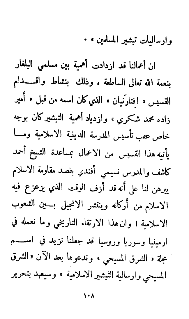 إن أعمالنا قد ازدادت أهمية بين مسلمي البلغار بنعمة الله تعالى الساطعة، وذلك بنشاط وإقدام القسيس «أفتارنيان» الذي كان اسمه من قبل «أمير زاده محمد شكري» وازدياد أهمية التبشير كان بوجه خاص عقب تأسيس المدرسة الدينية الإسلامية وما يأتيه هذا القسيس من الأعمال بمساعدة الشيخ أحمد كاشف والمدرس نسيمي أفندي بقصد مقاومة الإسلام، يبرهن لنا على أنه قد أزف الوقت الذي يزعزع فيه الإسلام من أركانه وينتشر الإنجيل بين الشعوب الإسلامية! وأن هذا الارتقاء التاريخي وما نعمله في أرمينيا وسوريا وروسيا قد جعلنا نزيد في اسم مجلتنا " الشرق المسيحي" وندعوها بعد الآن "الشرق المسيحي وإرسالية التبشير الإسلامية " وسيعهد بتحرير