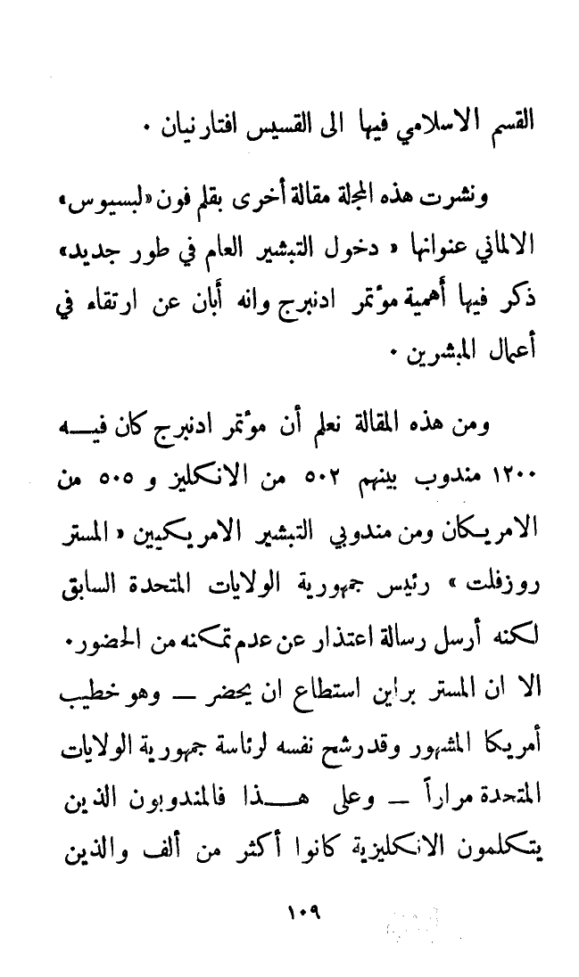 ومن هذه المقالة نعلم أن مؤتمر إدنبرج كان فيه 1200 مندوب بينهم 502 من الإنكليز و505 من الأمريكان ومن مندوبي التبشير الأمريكيين «المستر روزفلت» رئيس جمهورية الولايات المتحدة السابق لكنه أرسل رسالة اعتذار عن عدم تمكنه من الحضور. إلا أن المستر براين استطاع أن يحضر - وهو خطيب أمريكا المشهور وقد رشح نفسه لرئاسة جمهورية الولايات المتحدة مِرَارًا - وعلى هذا فالمندوبون الذين يتكلمون الإنكليزية كانوا أكثر من ألف، والذين