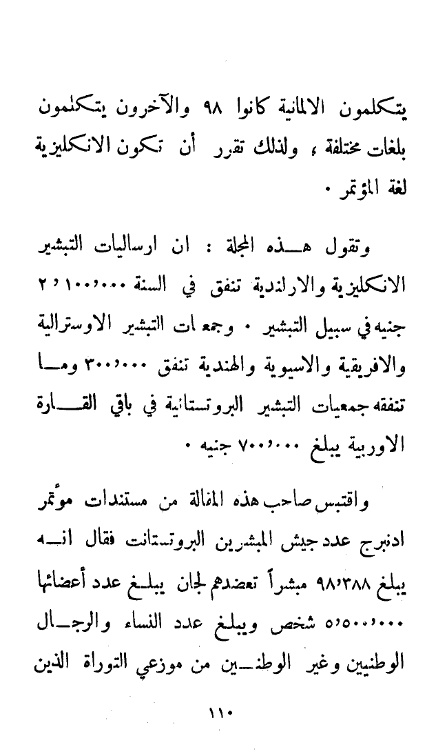 وتقول هذه المجلة: إن إرساليات التبشير الإنكليزية والإيرلندية تنفق في السنة 2.100.000 جنيه في سبيل التبشير. وجمعيات التبشير الأمريكية والكندية تنفق 2.000.000 جنيه، وجمعيات التبشير الأسترالية والأفريقية والآسيوية والهولندية تنفق 300.000 جنيه وما تنفقه جمعيات التبشير البروتستانية في باقي القارة الأوروبية يبلغ 700.000 جنيه.