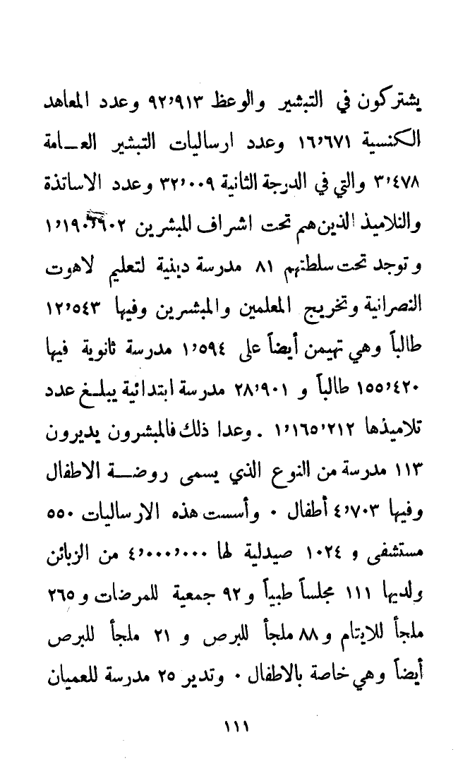 يشتركون في التبشير والوعظ 92.913 وعدد المعاهد الكنسية 16.671 وعدد إرساليات التبشير العامة 3.478 والتي في الدرجة الثانية 32.009 وعدد الأساتذة والتلاميذ الذين هم تحت إشراف المُبَشِّرِينَ 1.190.602 وتوجد تحت سلطتهم 81 مدرسة دينية لتعليم لاهوت النصرانية وتخريج المعلمين والمُبَشِّرِينَ وفيها 12.543 طَالِبًا وهي تهيمن أيضًا على 1.594 مدرسة ثانوية فيها 155.420 طَالِبًا و28.901 مدرسة ابتدائية يبلغ عدد تلاميذها 1.165.212 وعدا ذلك فالمُبَشِّرُونَ يديرون 113 مدرسة من النوع الذي يُسَمَّى روضة الأطفال وفيها 4.703 أطفال. وأسست هذه الإرساليات 550 مستشفى و 1024 صيدلية لها 4.000.000 من الزبائن، ولديها 111 مجلسًا طبيًا و92 جمعية للممرضات و265 ملجأ للأيتام و88 ملجأ للبرص و21 ملجأ للبرص أيضًا وهي خاصة بالأطفال وتدير 25 مدرسة للعميان