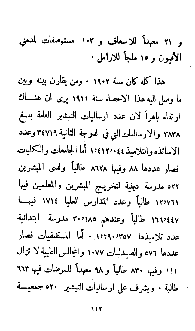 هذا كله سنة 1902. ومن يقارن بينه وبين ما وصل إليه هذا الإحصاء سنة 1911 يرى أن هناك ارتقاء بَاهِرًا لأن عدد إرساليات التبشير العامة بلغ 3838 والإرساليات التي في الدرجة الثانية 34719 وعدد الأساتذة والتلاميذ 1.412.044 أما الجامعات والكليات فصار عددها 88 وفيها 8628 طَالِبًا ولدى المُبَشِّرِينَ 522 مدرسة دينية لتخريج المُبَشِّرِينَ والمعلمين، فيها 12.671 طَالِبًا وعدد المدارس العالية 1714 فيها 166.447 طَالِبًا وعندهم 30.185 مدرسة ابتدائية عدد تلاميذها 1.920.357 أما المستشفيات فصار عددها 576 والصيدليات 1077 والمجالس الطبية لا تزال 111 وفيها 830 طَالِبًا و98 معهدًا للممرضات فيها 663 طالبة ويشرف على إرساليات التبشير 520 جمعية