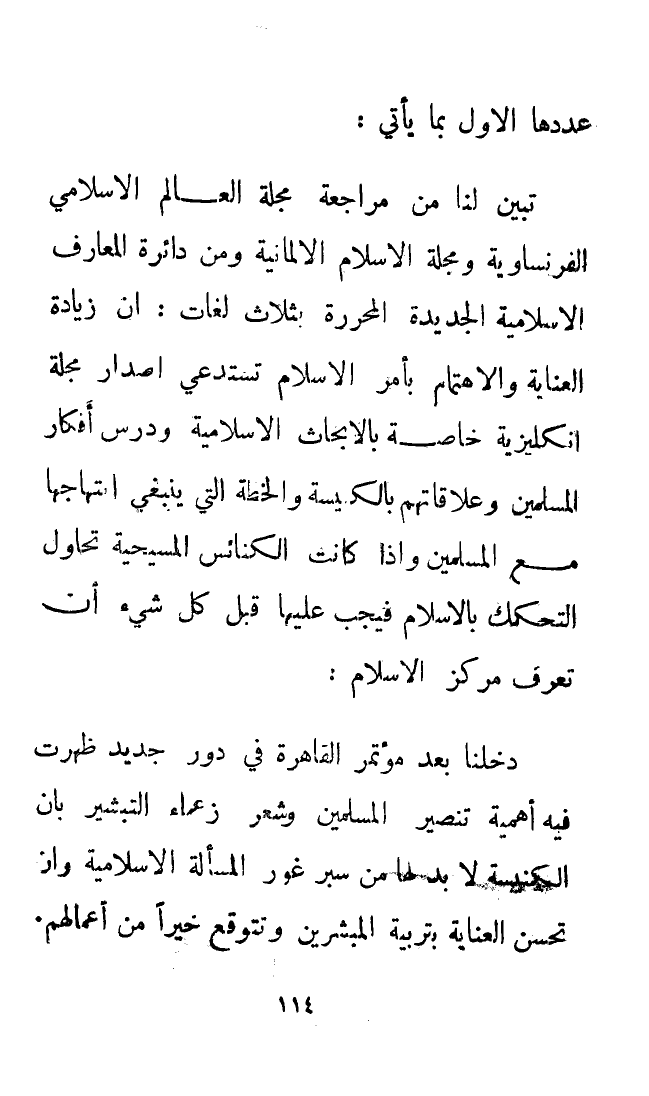 تبين لنا من مراجعة مجلة " العالم الإسلامي" الفرنساوية و" مجلة الإسلام " الألمانية ومن " دائرة المعارف الإسلامية " الجديدة المحررة بثلاث لغات: أن زيادة العناية والاهتمام بأمر الإسلام تستدعي إصدار مجلة إنكليزية خاصة بالأبحاث الإسلامية ودرس أفكار المسلمين وعلاقاتهم بالكنيسة والخطة التي ينبغي انتهاجها مع المسلمين وإذا كانت الكنائس المسيحية تحاول التحكك بالإسلام فيجب عليها قبل كل شيء أن تعرف مركز الإسلام.