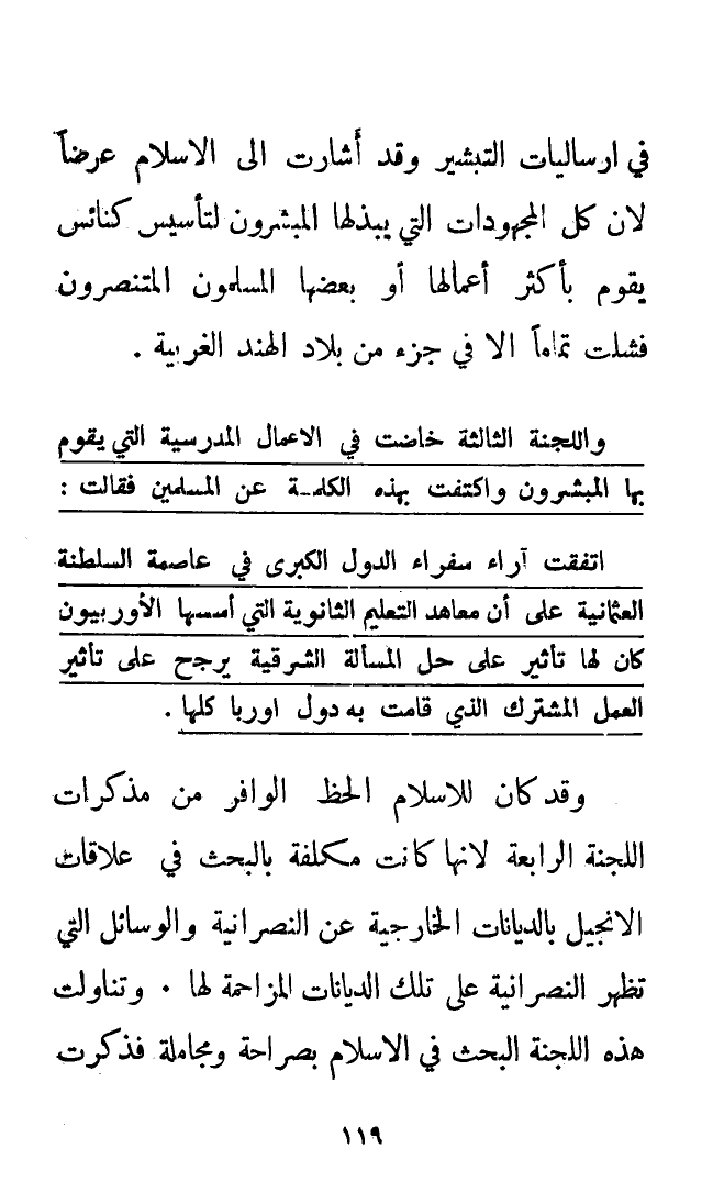 واللجنة الثالثة خاضت في الأعمال المدرسية التي يقوم بها المُبَشِّرُونَ واكتفت بهذه الكلمة عن المسلمين فقالت: