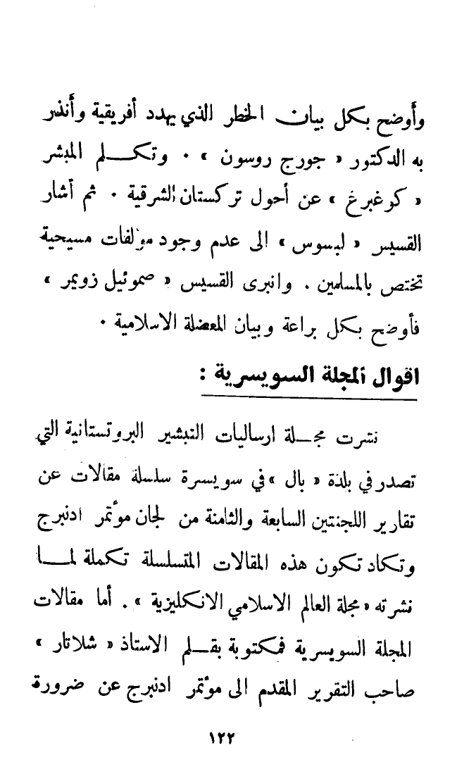 وأوضح بكل بيان الخطر الذي يهدد أفريقيا وأنذر به الدكتور «جورج روسون». وتكلم المبشر «كوغبرغ» عن أحوال تركستان الشرقية. ثم أشار القسيس «لبسوس» إلى عدم وجود مؤلفات مسيحية تختص بالمسلمين. وانبرى القسيس «صموئيل زويمز» فأوضح بكل براعة وبيان المعضلة الإسلامية العمومية.