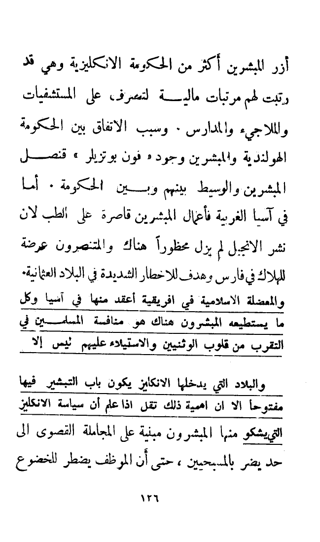 أزر المُبَشِّرِينَ أكثر من الحكومة الإنجليزية وهي قد رتبت لهم مرتبات مالية لتصرف على المستشفيات والملاجئ والمدارس. وسبب الاتفاق بين الحكومة الهولندية والمُبَشِّرِينَ وجود (فون بوتزيلر) قنصل المُبَشِّرِينَ والوسيط بينهم وبين الحكومة. أما في آسيا الغربية فأعمال المُبَشِّرِينَ قاصرة على الطب لأن نشر الإنجيل لم يزل محظورًا هناك وَالمُتَنَصِّرونَ عرضه للهلاك في فارس وهدف للأخطار الشديدة في البلاد العثمانية. والمعضلة الإسلامية في أفريقيا أعقد منها في آسيا وكل ما يستطيعه المُبَشِّرُونَ هناك هو منافسة المسلمين في التقرب من الوثنيين والاستيلاء عليهم ليس إلا.