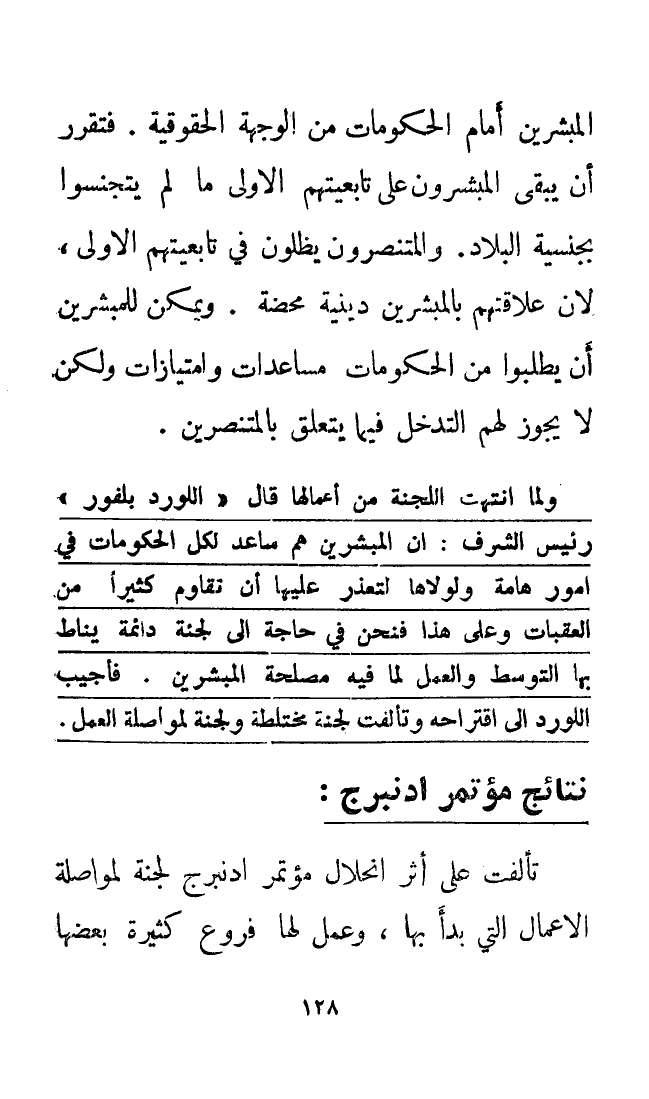 المُبَشِّرِينَ أمام الحكومات من الوجهة الحقوقية. فتقرر أن يبقى المُبَشِّرُونَ على تابعيتهم الأولى ما لم يتجنسوا بجنسية البلاد، وَالمُتَنَصِّرونَ يظلون في تابعيتهم الأولى، لأن علاقتهم بالمُبَشِّرِينَ دينية محضة. ويمكن للمبشرين أن يطلبوا من الحكومات مساعدات وامتيازات ولكن لا يجوز لهم التدخل فيما يتعلق بالمتنصرين.