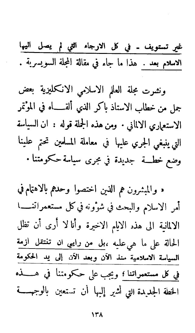 والمُبَشِّرُونَ هم الذين اختصوا وحدهم بالاهتمام في أمر الإسلام والبحث في شؤونه في كل مستعمراتنا الألمانية إلى هذه الأيام الأخيرة. وأنا لا أرى أن تظل الحالة على ما هي عليه، بل من رأيي أن تنتقل أزمة السياسة الإسلامية منذ الآن وبعد الآن إلى يد الحكومة في كل مستعمراتنا، ويجب على حكومتنا في هذه الخطة الجديدة التي أشير إليها أن تستعين بالوجهة