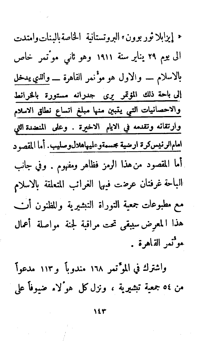 «إيزابلا ثوربوون» البروتستانية الخاصة بالبنات وامتدت إلى يوم 29 يناير سنة 1911 وهو ثاني مؤتمر خاص بالإسلام - والأول هو مؤتمر القاهرة - والذي يدخل إلى باحة ذلك المؤتمر يرى جدرانه مستورة بالخرائط والإحصائيات التي يتبين منها مبلغ اتساع نطاق الإسلام وارتقائه وتقدمه في الأيام الأخيرة، وعلى المنضدة التي أمام الرئيس كرة أرضية مجسمة وعليها هلال وصليب. أما المقصود من هذا الرمز فظاهر ومفهوم. وفي جانب الباحة غرفتان عرضت فيهما الغرائب المتعلقة بالإسلام مع مطبوعات جمعية التوراة التبشيرية، والمظنون أن هذا المعرض سيبقى تحت مراقبة لجنة مواصلة أعمال مؤتمر القاهرة.
