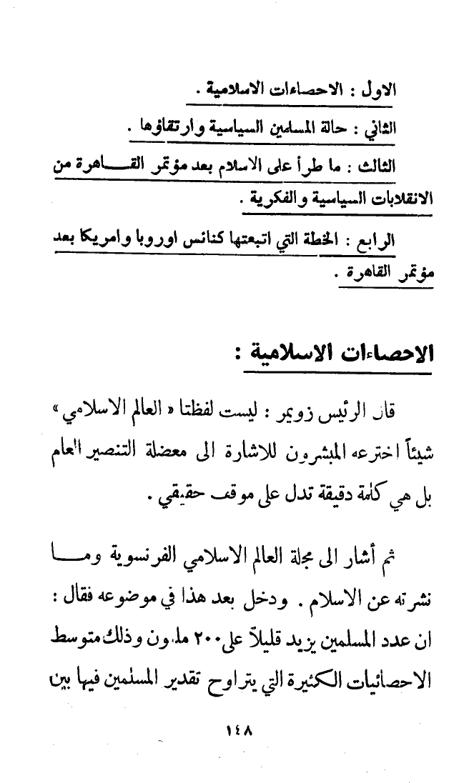ثم أشار إلى مجلة " العالم الإسلامي " الفرنسوية وما نشرته عن الإسلام. ودخل بعد هذا في موضوعه فقال: «إن عدد المسلمين يزيد قليلاً على 200 مليون وذلك متوسط الإحصائيات الكثيرة التي يتراوح تقدير المسلمين فيها بين