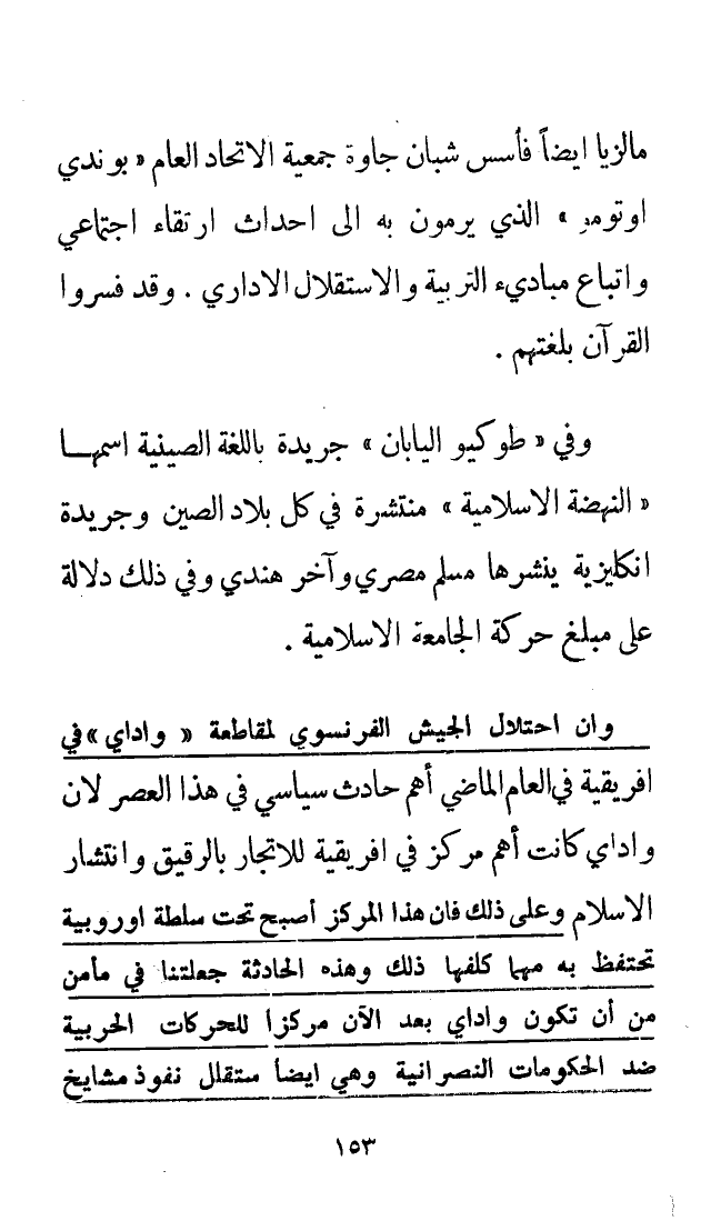 وإن احتلال الجيش الفرنسي لمقاطعة «واداي» في أفريقيا في العام الماضي أهم حادث سياسي في هذا العصر، لأن «واداي» كانت أهم مركز في أفريقيا للاتجار بالرقيق وانتشار الإسلام وعلى ذلك فإن هذا المركز أصبح تحت سلطة أوروبية تحتفظ به مهما كلفها ذلك وهذه الحادثة جعلتنا في مأمن من أن تكون «واداي» بعد الآن مركزًا للحركات الحربية ضد الحكومات النصرانية وهي أيضًا ستقلل نفوذ مشايخ
