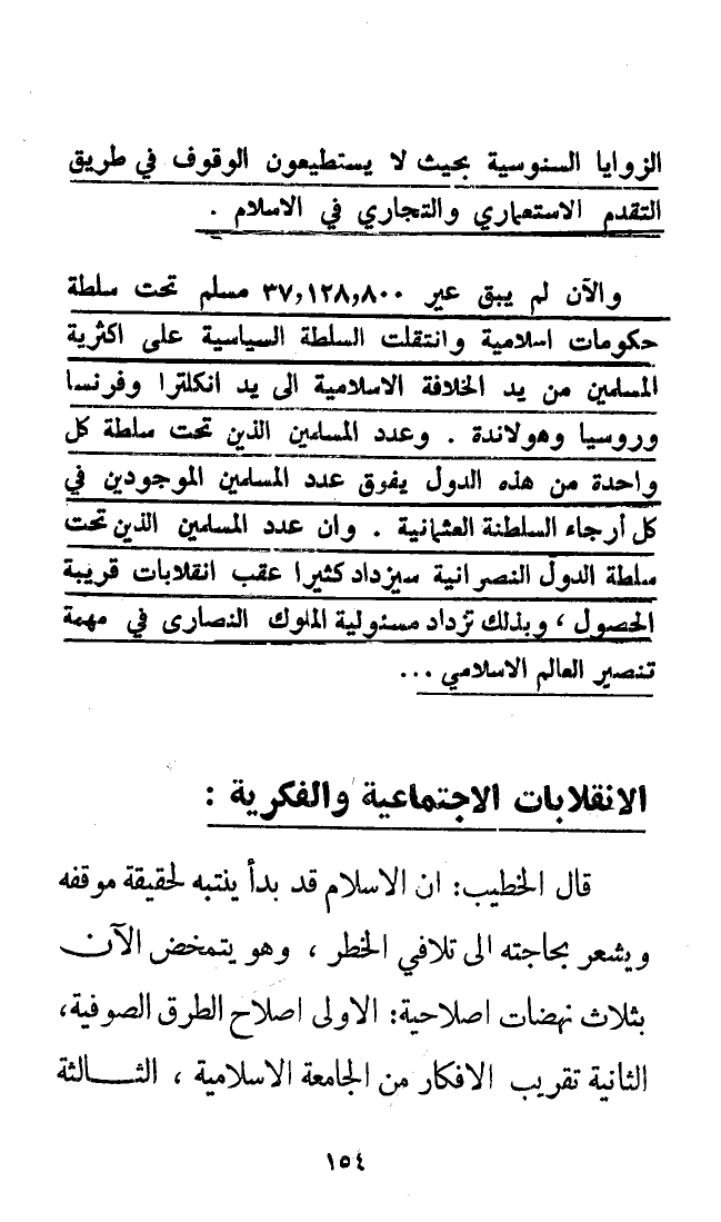 والآن لم يبق غير 27.128.800 مسلم تحت سلطة حكومات إسلامية، وانتقلت السلطة السياسية على أكثرية المسلمين من يد الخلافة الإسلامية إلى يد إنكلترا وفرنسا وروسيا وهولندا، وعدد المسلمين الذين تحت سلطة كل واحدة من هذه الدول يفوق عدد المسلمين الموجودين في كل أرجاء السلطنة العثمانية. وأن عدد المسلمين الذين تحت سلطة الدول النصرانية سيزداد كثيرًا عقب إنقلابات قريبة الحصول، وبذلك تزداد مسؤولية الملوك النصارى في مهمة تنصير العالم الإسلامي ...