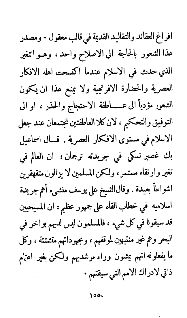 ومصدر هذا الشعور بالحاجة إلى الإصلاح واحد، وهو التغير الذي حدث في الإسلام عندما اكتسحت أهله الأفكار العصرية والحضارة الإفرنجية ولا يمنع هذا أن يكون الشعور مُؤَدِّيًا إلى عاطفة الاحتجاج والحذر، أو إلى التوفيق والتحكيم، لأن كِلاَ العاطفتين تجتمعان عند جعل الإسلام في مستوى الأفكار العصرية. قال إسماعيل بك غصبر نسكي في جريدته " ترجمان ": «إن العالم في تغير وارتقاء مستمر، ولكن المسلمين لا يزالون متقهقرين أشواطًا بعيدة». وقال الشيخ علي يوسف منشئ أهم جريدة إسلامية في خطاب ألقاه على جمهور عظيم: «إن المسيحيين قد سبقونا في كل شيء فالمسلمون ليس لديهم بواخر في البحر وهم غير منتبهين لموقفهم، ومجهوداتهم متشتتة، وكل ما يفعلونه أنهم يمشون وراء مرشديهم ولكن بغير اهتمام ذاتي لإدراك الأمم التي سبقتهم».