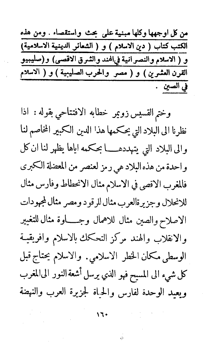 وختم القسيس (زويمر) خطابه الافتتاحي بقوله: «إذا نظرنا إلى البلاد التي يحكمها هذا الدين الكبير المخاصم لنا وإلى البلاد التي يتهددها بحكمه إياها يظهر لنا أن كل واحدة من هذه البلاد هي رمز لعنصر من المعضلة الكبرى: فالمغرب الأقصى في الإسلام مثال الانحطاط، وفارس مثال للانحلال وجزيرة العرب مثال للرقود، ومصر مثال لمجهودات الإصلاح والصين مثال للإهمال، وجاوة مثال للتغير والانقلاب والهند مركز التحكك بالإسلام، وأفريقيا الوسطى مكان الخطر الإسلامي. والإسلام يحتاج قبل كل شيء إلى المسيح فهو الذي يرسل أشعة النور إلى المغرب، ويعيد الوحدة لفارس، والحياة لجزيرة العرب، والنهضة