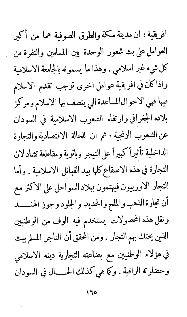 أفريقيا: إن مدينة مكة والطرق الصوفية هما من أكبر العوامل على بث شعور الوحدة بين المسلمين والنفرة من كل شيء غير إسلامي. وهذا ما يسمونه بالجامعة الإسلامية. وإذا كان في إفريقيا عوامل أخرى توجب تقدم الإسلام فيها فهي الأحوال المساعدة التي يتصف بها الإسلام ومركز بلاده الجغرافي وارتقاء الشعوب الإسلامية في السودان عن الشعوب الزنجية. ثم إن للحالة الاقتصادية وللتجارة الداخلية تأثيرًا كبيرًا على النيجر وبانوية ومقاطعة تشاد لأن التجارة في هذه الأصقاع كلها بيد القبائل الإسلامية. وأما التجار الأوروبيون فيهتمون ببلاد الساحل على الأكثر مع أن تجارة الذهب والملح والحديد والجلود وجوز الهند ونقل هذه المحصولات يستخدم فيه ألوف من الوطنيين الذين يحتك بهم التجار. ومن المحقق أن التاجر المسلم يبث في هؤلاء الوطنيين مع بضاعته التجارية دينه الإسلامي وحضارته الراقية. وكما هي كذلك الحال في السودان