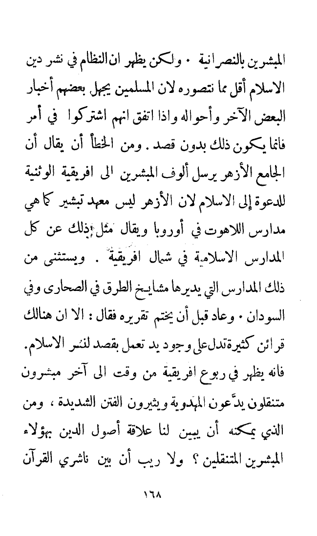 المُبَشِّرِينَ بالنصرانية. ولكن يظهر أن النظام في نشر دين الإسلام أقل مما نتصوره لأن المسلمين يجهل بعضهم أخبار البعض الآخر وأحواله وإذا اتفق أنهم اشتركوا في أمر فإنما يكون ذلك بدون قصد. ومن الخطأ أن يقال إن الجامع الأزهر يرسل ألوف المُبَشِّرِينَ إلى إفريقيا الوثنية للدعوة إلى الإسلام لأن الأزهر ليس معهد تبشير كما هي مدارس اللاهوت في أوروبا. ويقال مثل ذلك عن كل المدارس الإسلامية في شمال إفريقيا. ويستثنى من ذلك المدارس التي يديرها مشايخ الطرق في الصحاري وفي السودان. وعاد قبل أن يختم تقريره فقال: إلا أن هنالك قرائن كثيرة تدل على وجود يد تعمل بقصد لنشر الإسلام. فإنه يظهر في ربوع إفريقيا من وقت إلى آخر مبشرون متنقلون يدعون المهدوية ويثيرون الفتن الشديدة ومن الذي يمكنه أن يبين لنا علاقة أصول الدين بهؤلاء المُبَشِّرِينَ المُتَنَقِّلِينَ؟ ولا ريب أن بين ناشري القرآن