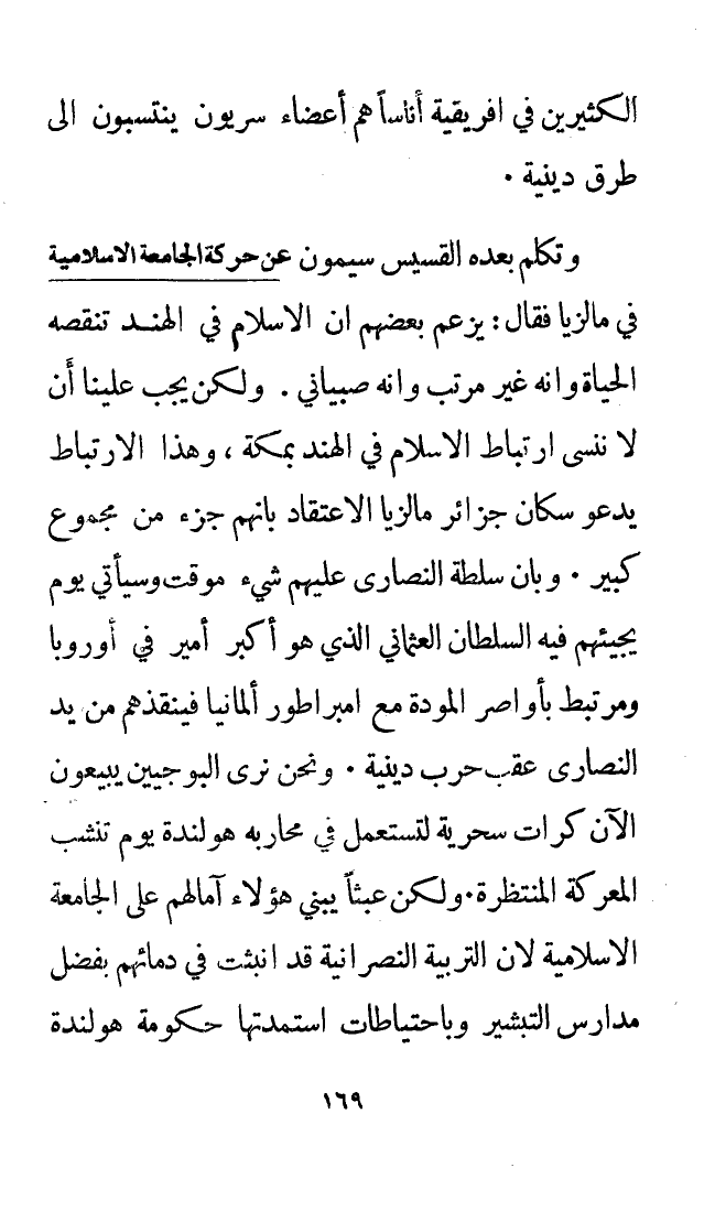 وتكلم بعده القسيس سيمون عن حركة الجامعة الإسلامية في ماليزيا فقال: يزعم بعضهم أن الإسلام في الهند تنقصه الحياة وأنه غير مرتب وأنه صبياني. ولكن يجب علينا أن لا ننسى ارتباط الإسلام في الهند بمكة، وهذا الارتباط يدعو سكان جزائر ماليزيا إلى الاعتقاد بأنهم جزء من مجموع كبير. وبأن سلطة النصارى عليهم شيء مؤقت وسيأتي يوم يجيئهم فيه السلطان العثماني الذي هو أكبر أمير في أوروبا ومرتبط بأواصر المودة مع إمبراطور ألمانيا فينقذهم من يد النصارى عقب حرب دينية. ونحن نرى البوجيين يبيعون الآن كرات سحريه لتستعمل في محاربة هولندة يوم تنشب المعركة المنتظرة. ولكن عَبَثًا يبني هؤلاء آمالهم على الجامعة الإسلامية لأن التربية النصرانية قد انبثت في دمائهم بفضل مدارس التبشير وباحتياطات استمدتها حكومة هولندة