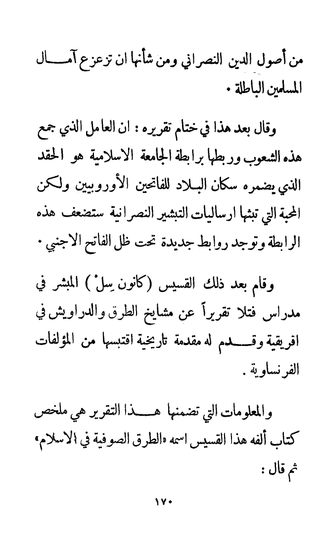 وقال بعد هذا في ختام تقريره: إن العامل الذي جمع هذه الشعوب وربطها برابطة الجامعة الإسلامية هو الحقد الذي يضمره سكان البلاد للفاتحين الأوروبيين ولكن المحبة التي تبثها إرساليات التبشير النصرانية ستضعف هذه الرابطة وتوجد روابط جديدة تحت ظل الفاتح الأجنبي.