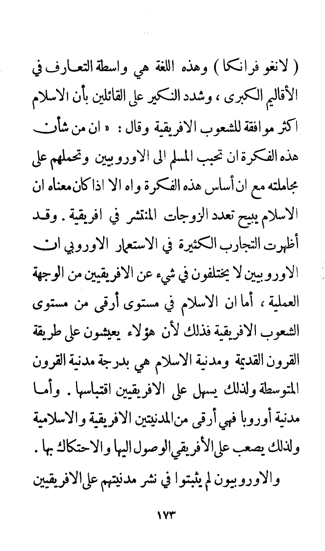 (لانغو فرانكا) وهذه اللغة هي واسطة التعارف في الأقاليم الكبرى، وشدد النكير على القائلين بأن الإسلام أكثر موافقة للشعوب الأفريقية وقال: إن من شأن هذه الفكرة أن تحبب المسلم إلى الأوروبيين وتحملهم على مجاملته مع أن أساس هذه الفكرة وَاهٍ إلا إذا كان معناه أن الإسلام يبيح تعدد الزوجات المنتشر في أفريقيا وقد أظهرت التجارب الكثيرة في الاستعمار الأوروبي أن الأوربيين لا يختلفون في شيء عن الأفريقيين من الوجهة العملية، أما أن الإسلام في مستوى أرقى من مستوى الشعوب الأفريقية فذلك لأن هؤلاء يعيشون على طريقة القرون القديمة ومدنية الإسلام هي بدرجة مدنية القرون المتوسطة ولذلك يسهل على الإفريقيين اقتباسها. وأما مدنية أوروبا فهي أرقى من المدنيتين الأفريقية والإسلامية، ولذلك يصعب على الأفريقي الوصول إليها والاحتكاك بها.