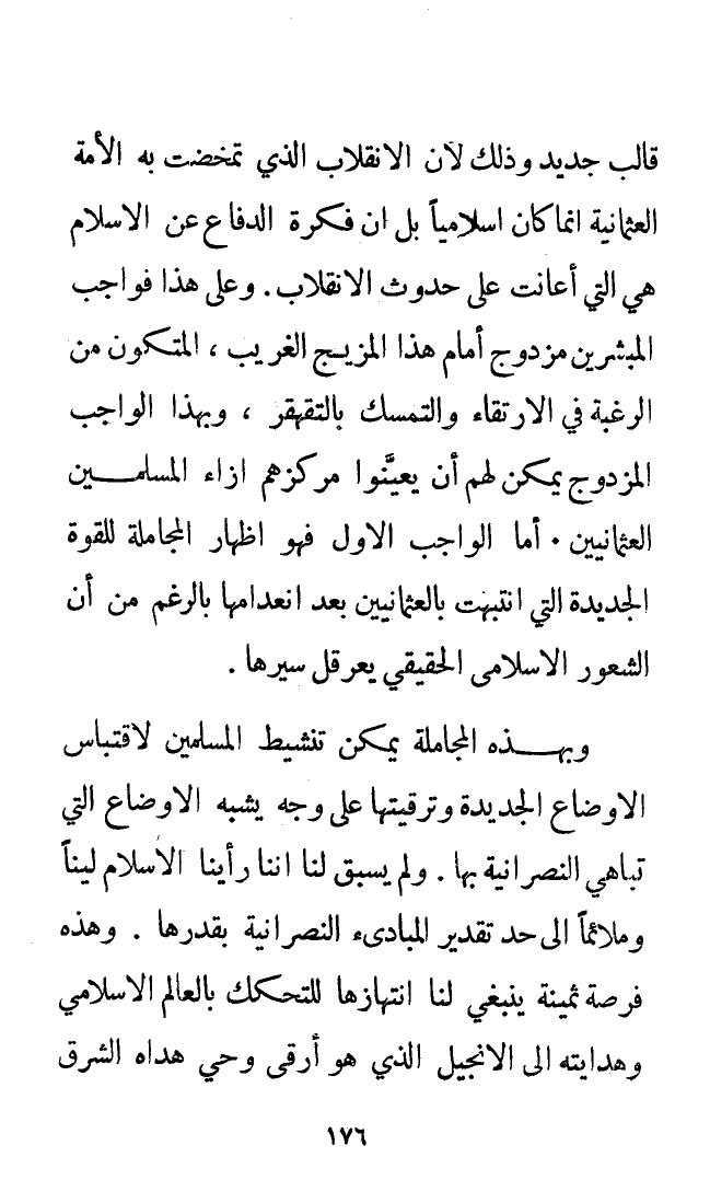 قالب جديد وذلك لأن الانقلاب الذي تمخضت به الأمة العثمانية إنما كان إسلاميًا بل إن فكرة الدفاع عن الإسلام هي التي أعانت على حدوث الانقلاب.