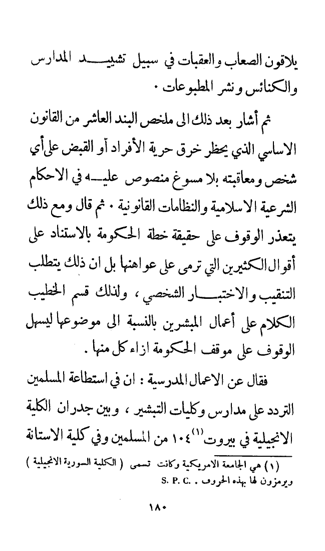 ثم أشار بعد ذلك إلى ملخص البند العاشر من القانون الأساسي الذي يحظر خرق حرية الأفراد أو القبض على أي شخص ومعاقبته بلا مسوغ منصوص عليه في الأحكام الشرعية الإسلامية والنظامات القانونية. ثم قال: ومع ذلك يتعذر الوقوف على حقيقة خطة الحكومة بالاستناد على أقوال الكثيرين التي ترمي على عواهنها بل إن ذلك يتطلب التنقيب والاختبار الشخصي، ولذلك قسم الخطيب الكلام على أعمال المُبَشِّرِينَ بالنسبة إلى موضوعها ليسهل الوقوف على موقف الحكومة إزاء كل منها.
