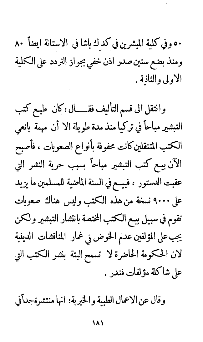 وانتقل إلى قسم التأليف فقال: كان طبع كتب التبشير مُبَاحًا في تركيا منذ مدة طويلة إلا أن مهمة بائعي الكتب المتنقلين كانت محفوفة بأنواع الصعوبات، فأصبح الآن بيع الكتب التبشيرية مُبَاحًا بسبب حرية النشر التي عقبت الدستور، فبيع في السنة الماضية للمسلمين ما يزيد على 9000 نسخة من هذه الكتب وليس هناك صعوبات تقوم في سبيل بيع الكتب المختصة بانتشار التبشير ولكن يجب على المؤلفين عدم الخوض في غمار المناقشات الدينية لأن الحكومة الحاضرة لا تسمح البتة بنشر الكتب التي على شاكلة مؤلفات (فندر).