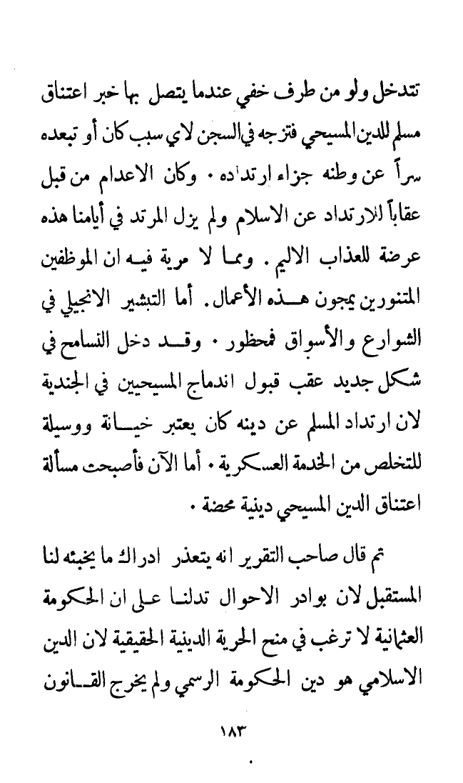 تتدخل ولو من طرف خفي عندما يتصل بها خبر اعتناق مسلم للدين المسيحي فتزجه في السجن لأي سبب كان أو تبعده سِرًّا عن وطنه جزاء ارتداده. وكان الإعدام من قبل عقابًا للارتداد عن الإسلام ولم يزل المرتد في أيامنا هذه عرضة للعذاب الأليم. ومما لا مرية فيه أن الموظفين المتنورين يمجون هذه الأعمال. أما التبشير الإنجيلي في الشوارع والأسواق فمحظور. وقد دخل التسامح في شكل جديد عقب قبول اندماج المسيحيين في الجندية لأن ارتداد المسلم عن دينه كان يعتبر خيانة ووسيلة للتخلص من الخدمة العسكرية. أما الآن فأصبحت مسألة اعتناق الدين المسيحي دينية محضة.