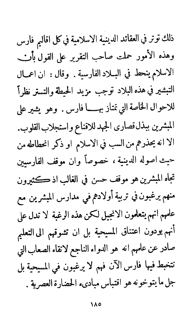 ذلك توتر في العقائد الدينية الإسلامية في كل أقاليم فارس وهذه الأمور حملت صاحب التقرير على القول بأن الإسلام ينحط في البلاد الفارسية وقال: إن أعمال التبشير في هذه البلاد توجب مزيد الحيطة والتستر نَظَرًا للأحوال الخاصة التي تمتاز بها فارس وهو يشير على المُبَشِّرِينَ ببذل قصارى الجهد للإقناع واستجلاب القلوب إلا أنه يحذرهم من السب في الإسلام أو ذكر انحطاطه من حيث أصوله الدينية، خصوصًا وأن موقف الفارسيين تجاه المُبَشِّرِينَ هو موقف حسن في الغالب إذ كثيرون منهم يرغبون في تربية أولادهم في مدارس المُبَشِّرِينَ مع علمهم أنهم يتعلمون الإنجيل لكن هذه الرغبة لا تدل على أنهم يودون اعتناق المسيحية بل إن تشوقهم إلى التعليم صادر عن علمهم أنه هو الدواء الناجع لاتقاء الصعاب التي تتخبط فيها فارس الآن فهم لا يرغبون في المسيحية بل جل ما يتوخونه هو اقتباس مبادئ الحضارة العصرية.