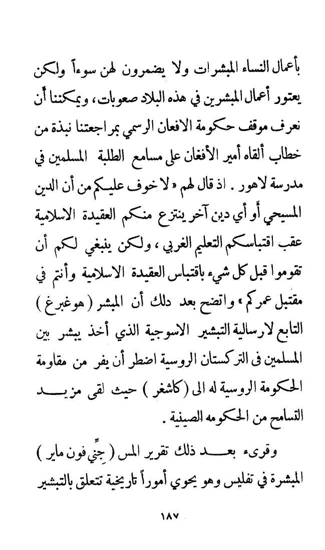 بأعمال النساء المبشرات ولا يضمرون لهن سُوءًا ولكن يعتور أعمال المُبَشِّرِينَ في هذه البلاد صعوبات ويمكننا أن نعرف موقف حكومة الأفغان الرسمي بمراجعتنا نبذة من خطاب ألقاه أمير الأفغان على مسامع الطلبة المسلمين في مدرسة لاهور. إذ قال لهم: «لا خوف عليكم من أن الدين المسيحي أو أي دين آخر ينتزع منكم العقيدة الإسلامية عقب اقتباسكم التعليم الغربي، ولكن ينبغي لكم أن تقوموا قبل كل شيء باقتباس العقيدة الإسلامية وأنتم في مقتبل عمركم» واتضح بعد ذلك أن المبشر (هوغبرغ) التابع لإرسالية التبشير الأسوجية الذي أخذ يبشر بين المسلمين في التركستان الروسية اضطر أن يفر من مقاومة الحكومة الروسية له إلى (كاشغر) حيث لقي مزيد من التسامح من الحكومة الصينية.