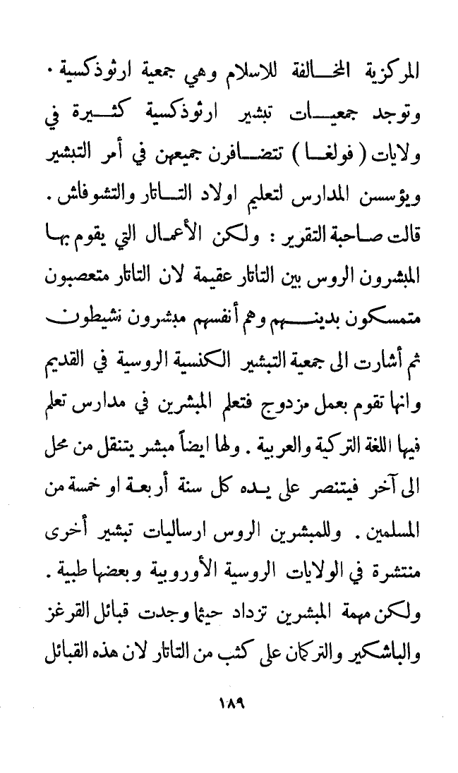 المركزية المخالفة للإسلام وهي جمعية أرثوذكسية. وتوجد جمعيات تبشير أرثوذكسية كثيرة في ولايات (فولغا) تتضافرن جميعهن في أمر التبشير ويؤسسن المدارس لتعليم أولاد التاتار والتشوفاش. قالت صاحبة التقرير: ولكن الأعمال التي يقوم بها المُبَشِّرُونَ الروس بين التاتار عقيمة لأن التتار متعصبون متمسكون بدينهم وهم أنفسهم مبشرون نشيطون. ثم أشارت إلى جمعية التبشير الكنسية الروسية في القديم وأنها تقوم بعمل مزدوج فتعلم المُبَشِّرِينَ في مدارس تعلم فيها اللغة التركية والعربية. ولها أيضًا مبشر يتنقل من محل إلى آخر فيتنصر على يده كل سنة أربعة أو خمسة من المسلمين. وللمبشرين الروس إرساليات تبشير أخرى منتشرة في الولايات الروسية الأوروبية وبعضها طبية. ولكن مهمة المُبَشِّرِينَ تزداد حيثما وجدت قبائل القرغز والباشكير والتركمان على كثب من التاتار لأن هذه القبائل