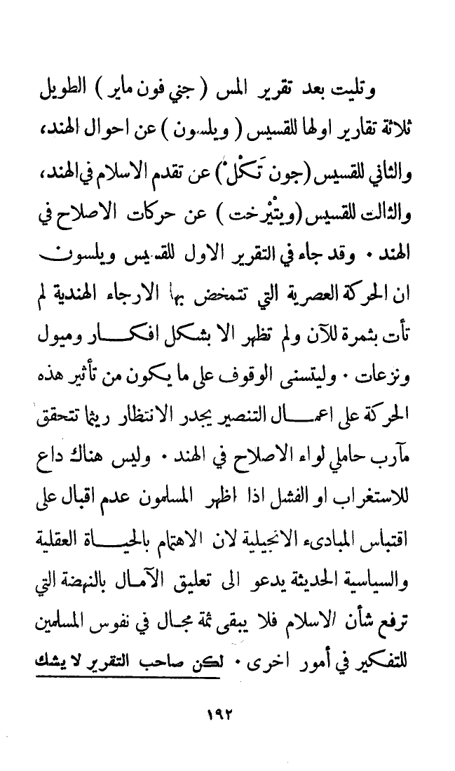 وليس هناك داع للاستغراب أو الفشل إذا أظهر المسلمون عدم إقبال على اقتباس المبادئ الإنجيلية لأن الاهتمام بالحياة العقلية والسياسية الحديثة يدعو إلى تعليق الآمال بالنهضة التي ترفع شأن الإسلام فلا يبقى ثمة مجال في نفوس المسلمين للتفكير في أمور أخرى. لكن صاحب التقرير لا يشك