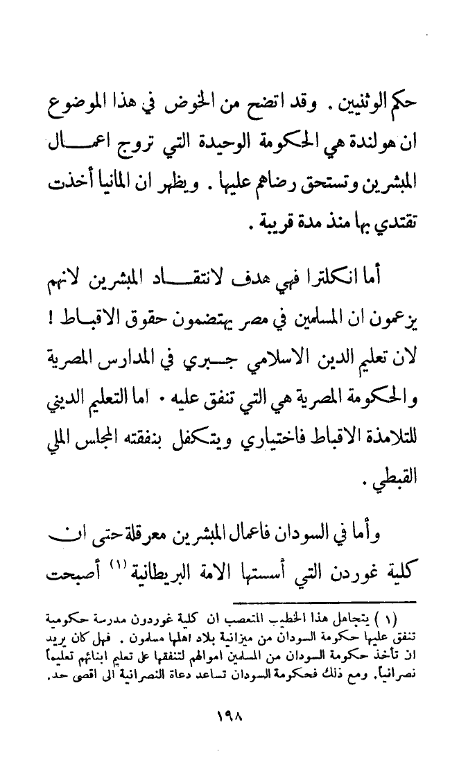 (¬1) يتجاهل هذا الخطيب المتعصب أن كلية غوردون مدرسة حكومية تنفق عليها حكومة السودان من ميزانية بلاد أهلها مسلمون. فهل كان يريد أن تأخذ حكومة السودان من المسلمين أموالهم على تعليم أبنائهم تعليمًا نصرانيًا. ومع ذلك فحكومة السودان تساعد دعاة النصرانية إلى أقصى حد.
