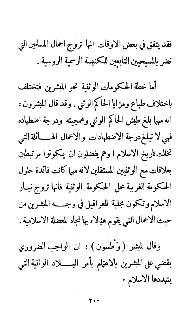 أما خطة الحكومات الوثنية نحو المُبَشِّرِينَ فتختلف باختلاف طباع ومزايا الحاكم الوثني. وقد قال المبشرون: إنه مهما بلغ طيش الحاكم الوثني وهمجيته ودرجة اضطهاده فهي لا تبلغ درجة الاضطهادات والأعمال الهائلة التي تخللت تاريخ الإسلام! وهم يفضلون أن يكونوا مرتبطين بعلاقات مع الوثنيين المستقلين لأنه مهما كانت فائدة حلول الحكومة الغربية محل الحكومة الوثنية فإنها تروج تيار الإسلام وتكون مجلبة للعراقيل في وجه المُبَشِّرِينَ من حيث الأعمال التي يقوم هؤلاء بها تجاه المعضلة الإسلامية.