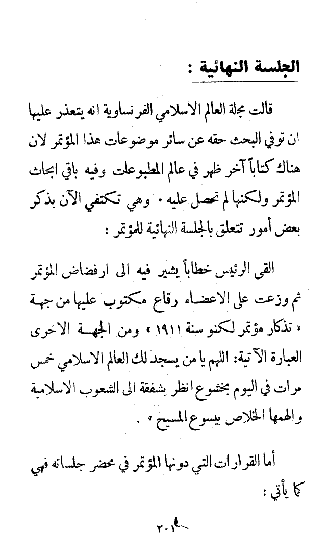 قالت مجلة " العالم الإسلامي " الفرنساوية: إنه يتعذر عليها أن توفي البحث حقه عن سائر موضوعات هذا المؤتمر لأن هناك كتابًا آخر ظهر في عالم المطبوعات وفيه باقي أبحاث المؤتمر ولكنها لم تحصل عليه. وهي تكتفي الآن بذكر بعض أمور تتعلق بالجلسة النهائية للمؤتمر.