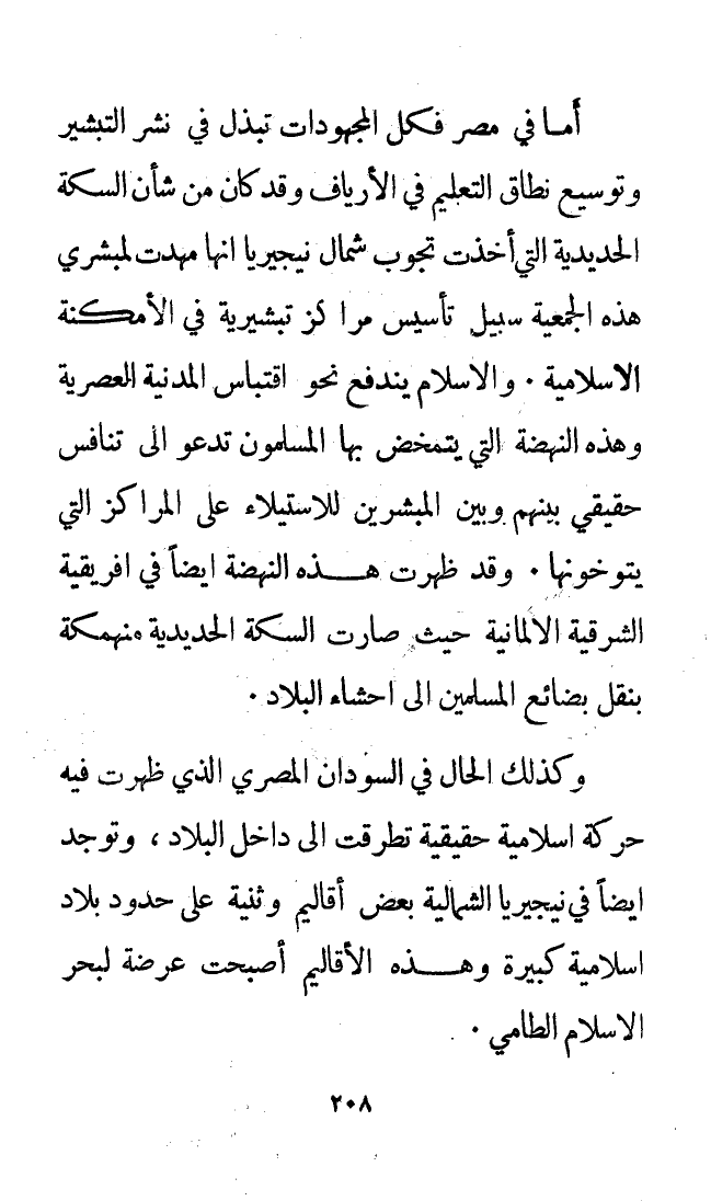 وكذلك الحال في السودان المصري الذي ظهرت فيه حركة إسلامية حقيقية تطرقت إلى داخل البلاد، وتوجد أيضًا في نيجيريا الشمالية بعض أقاليم وثنية على حدود بلاد إسلامية كبيرة وهذه الأقاليم أصبحت عرضة لبحر الإسلام الطامي.
