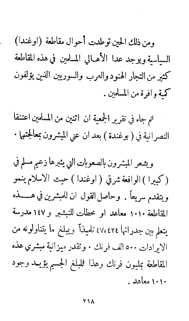 ويشعر المُبَشِّرُونَ بالصعوبات التي يثيرها زعيم مسلم في (كبيرا) الواقعة شرقي (أوغندا) حيث الإسلام ينمو ويتقدم سَرِيعًا. وحاصل القول إن للمبشرين في هذه المقاطعة 1010 معاهد أو محطات للتبشير و147 مدرسة يتعلم بين جدرانها 47.424 تلميذًا ويبلغ ما يتناولونه من الإيرادات 500 ألف فرنك. وتقدر ميزانية مبشري هذه المقاطعة بمليون فرنك. وهذا المبلغ الجسيم يؤيد وجود 1010 معاهد.