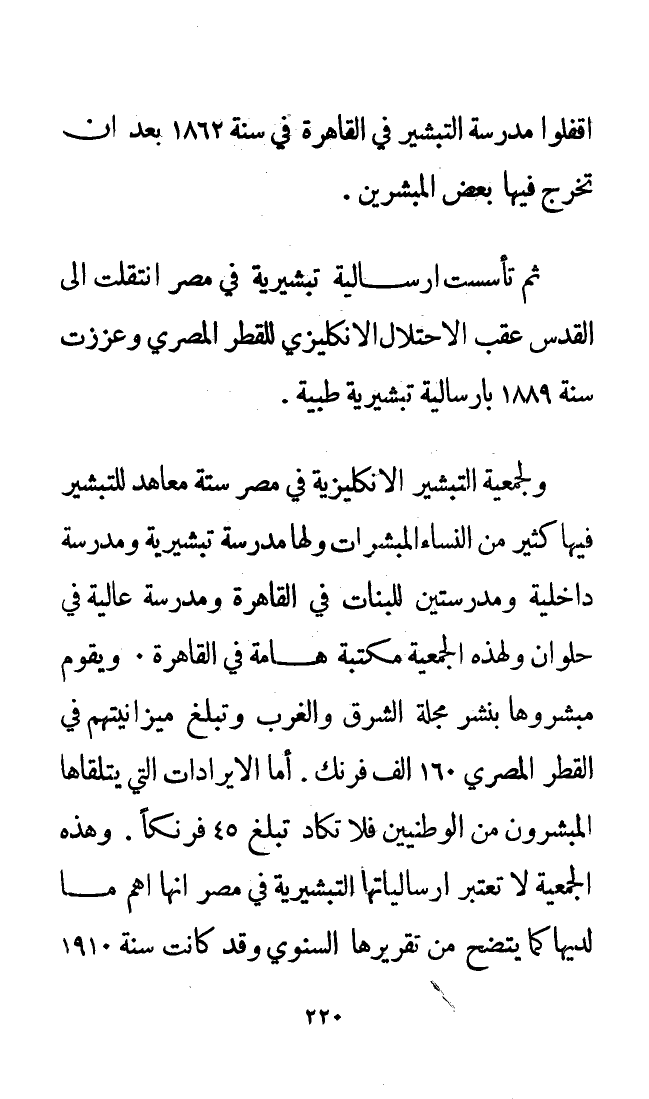 أقفلوا مدرسة التبشير في القاهرة سنة 1862 بعد أن تخرج فيها بعض المبشرين. ثم تأسست إرسالية تبشيرية في مصر انتقلت إلى القدس عقب الاحتلال الإنكليزي للقطر المصري وعززت سنة 1889 بإرسالية تبشيرية طبية.